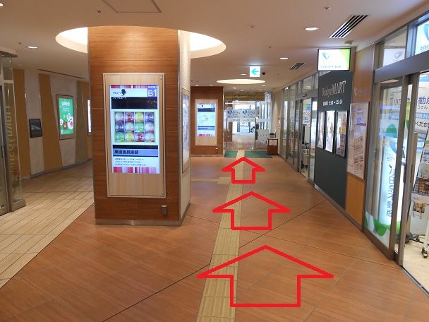 東口を左に曲がった後の風景です。矢印に従って交差点まで進んでください。